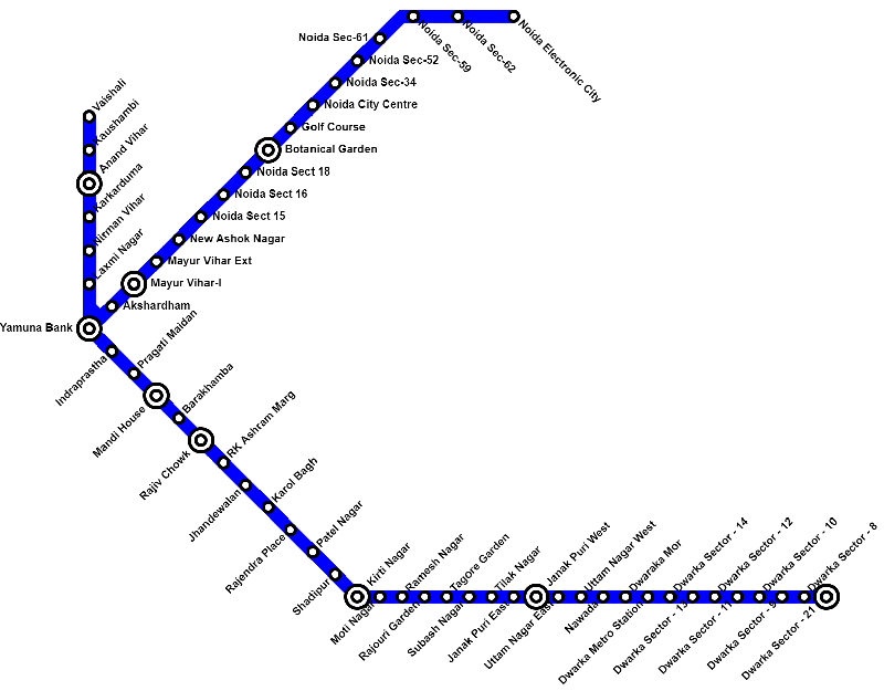Get the complete details of the Delhi Metro Blue Line including its route map, station list, fare, interchange points, and first–last train timings